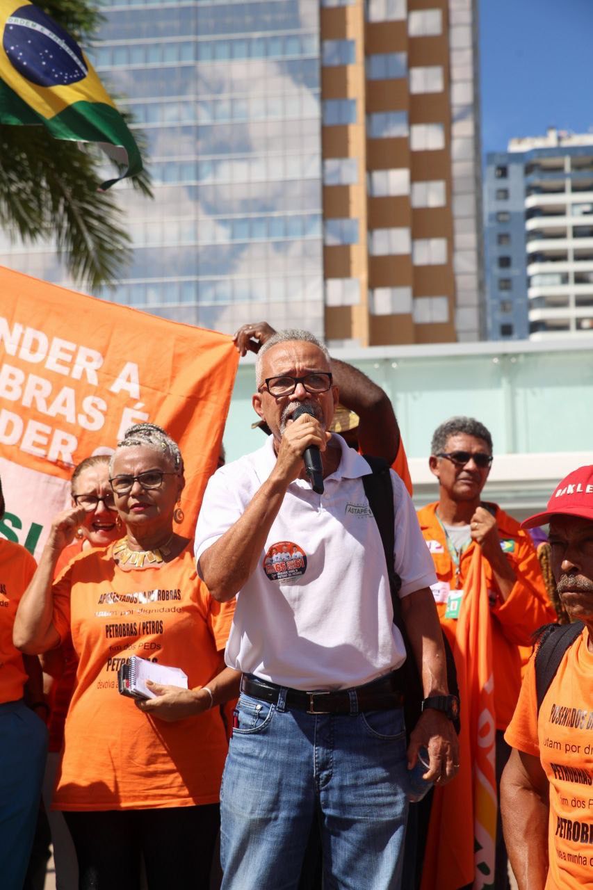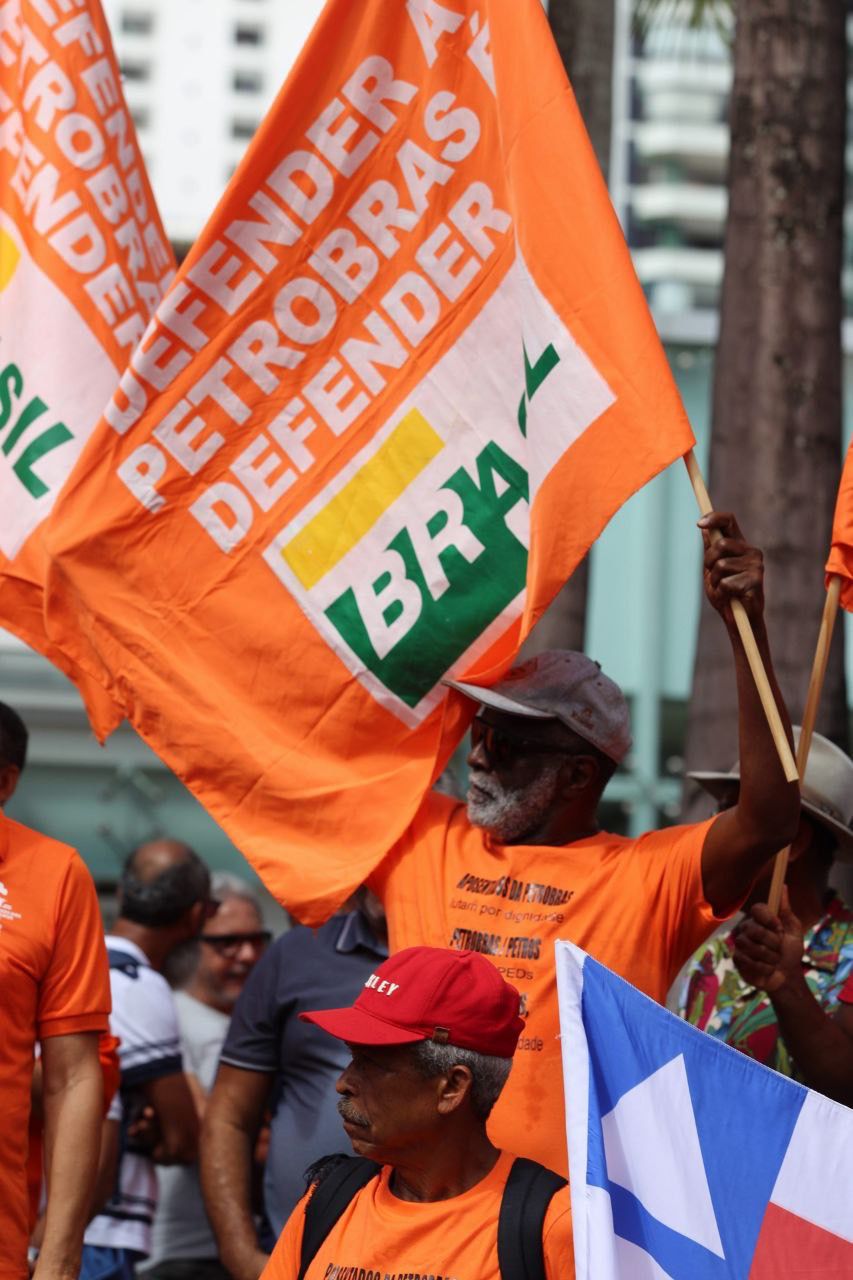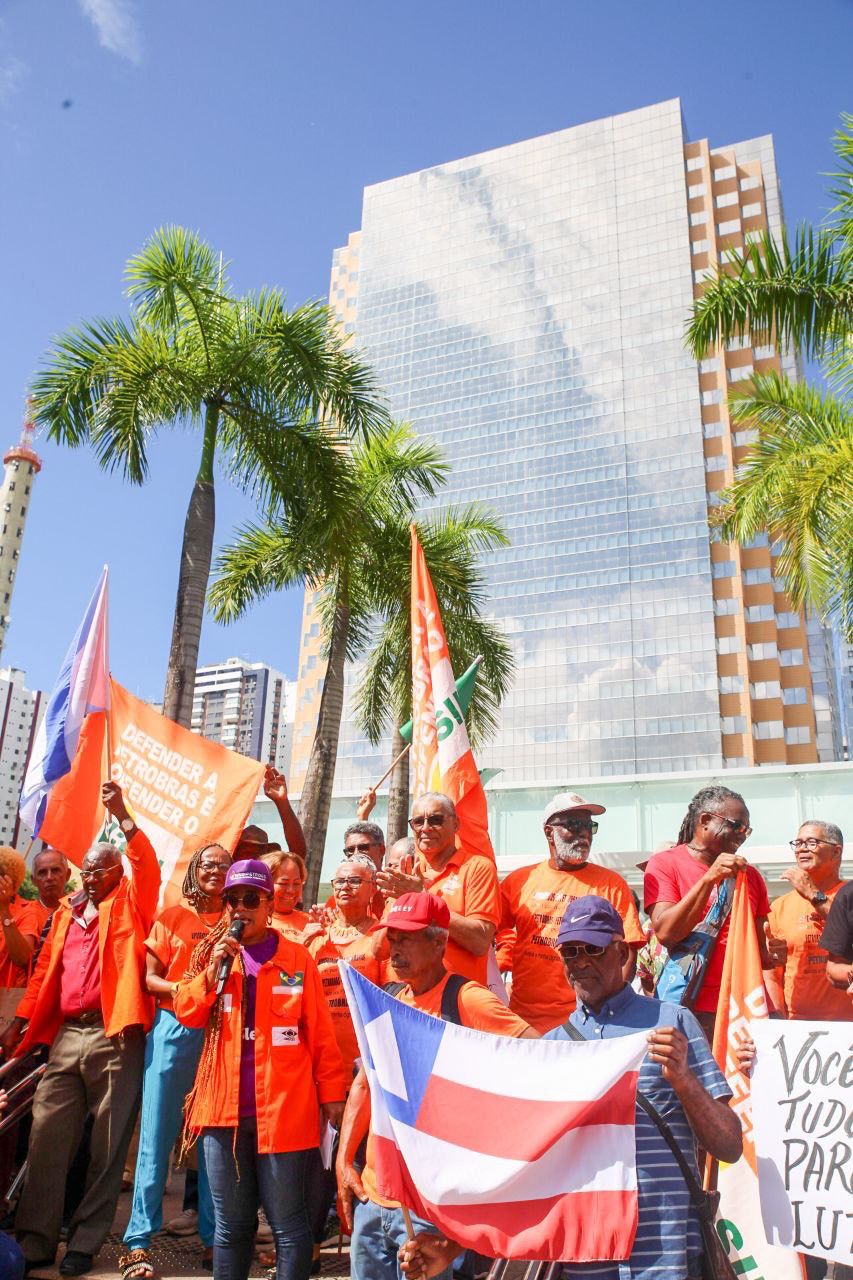 Com cartazes, bandeiras e faixas, centenas de aposentados, aposentadas e pensionistas da Petrobrás compareceram, na manhã desta quarta-feira (23), em frente ao edifício Torre Pituba, sede da estatal, em Salvador, na Bahia, para pedir o fim dos equacionamentos da Petros e cobrar da Petrobrás o pagamento de suas dívidas com o fundo de pensão.