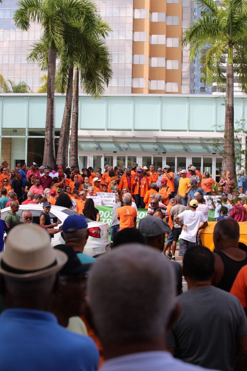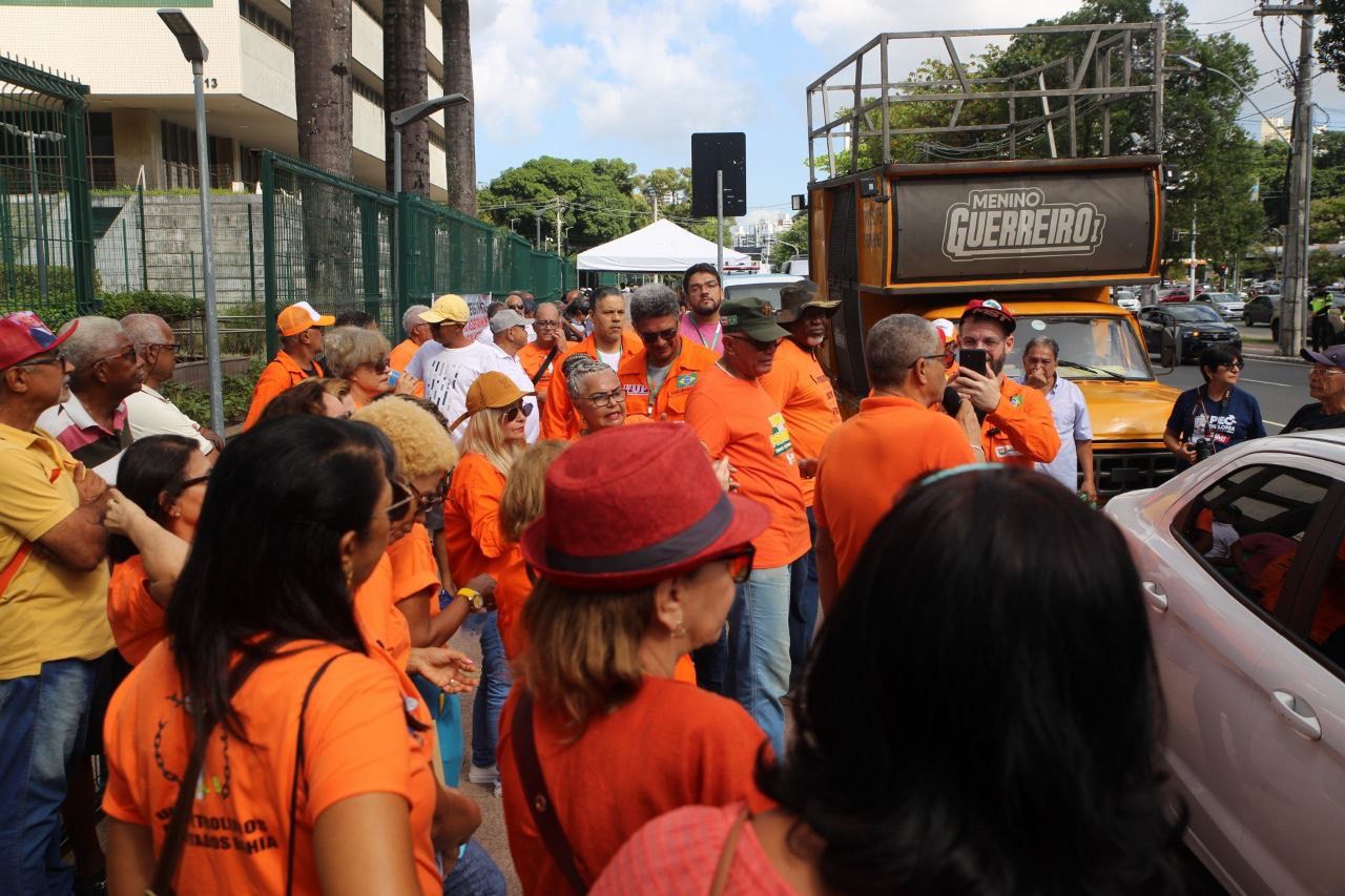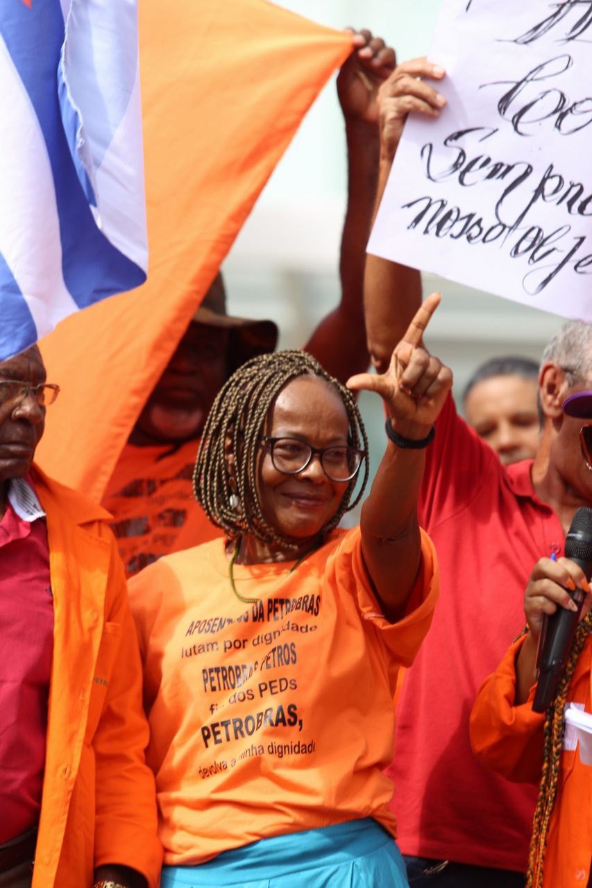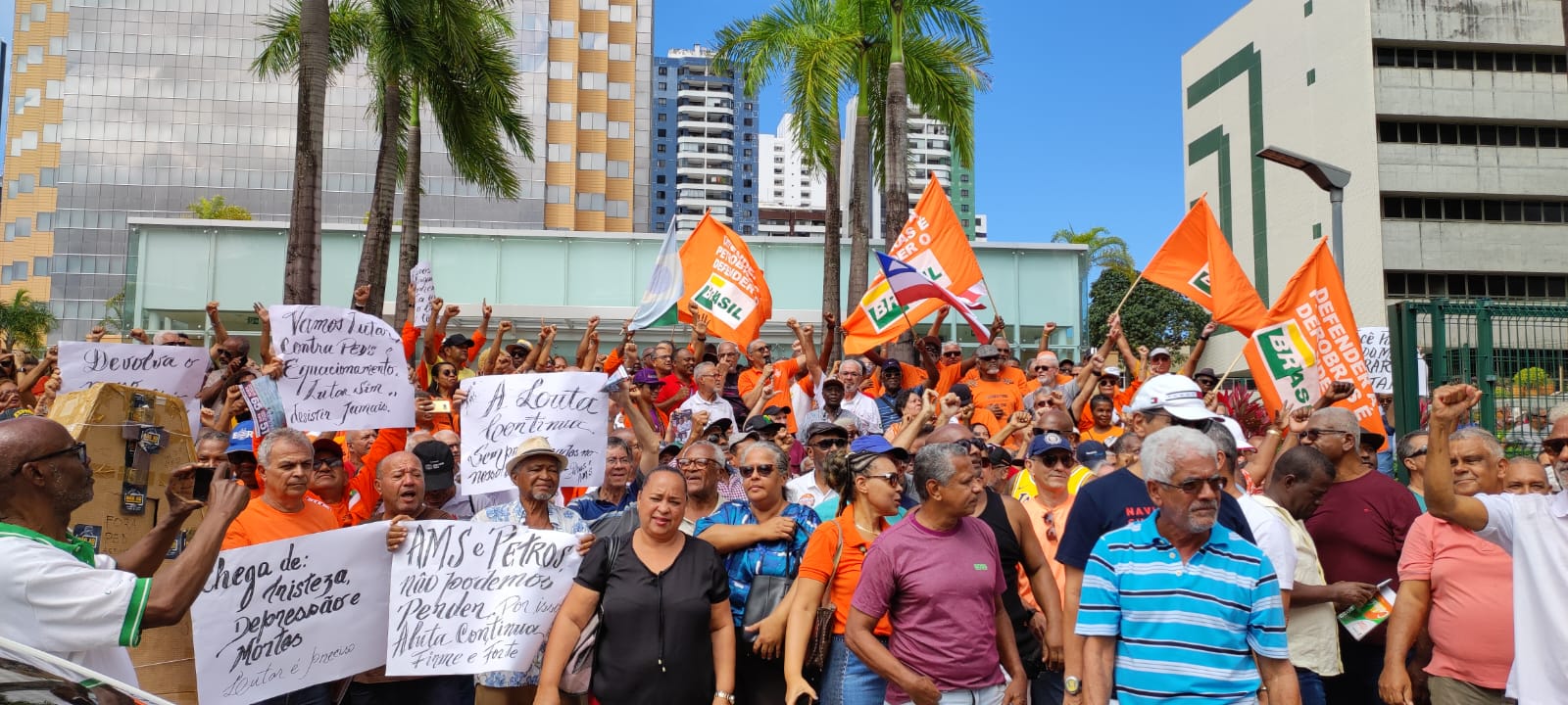 Com cartazes, bandeiras e faixas, centenas de aposentados, aposentadas e pensionistas da Petrobrás compareceram, na manhã desta quarta-feira (23), em frente ao edifício Torre Pituba, sede da estatal, em Salvador, na Bahia, para pedir o fim dos equacionamentos da Petros e cobrar da Petrobrás o pagamento de suas dívidas com o fundo de pensão.