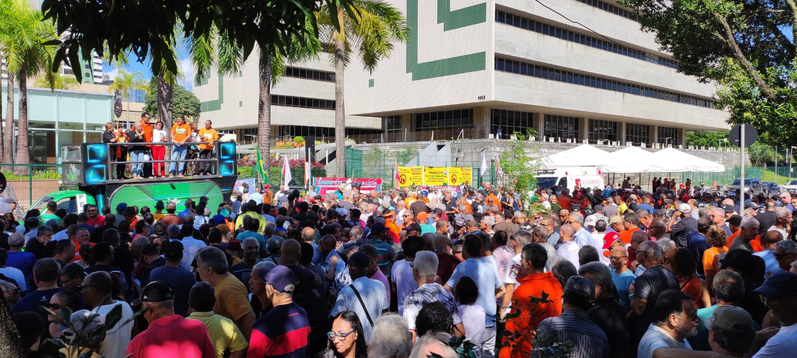 A frente do edifício Torre Pituba, antiga sede administrativa da Petrobrás, em Salvador, foi tomada por centenas de petroleiros (as) aposentados (as), pensionistas e trabalhadores (as) da ativa, na manhã desta terça-feira (30), em protesto contra os equacionamentos do plano de previdência da categoria (Petros).