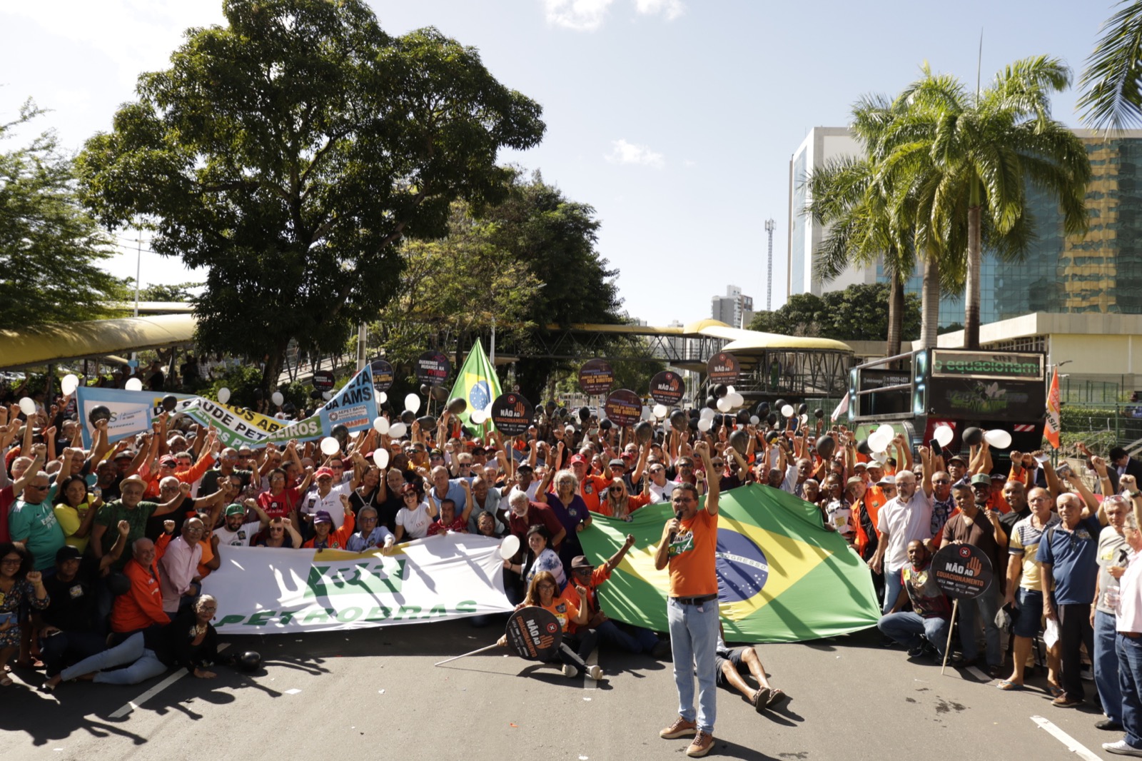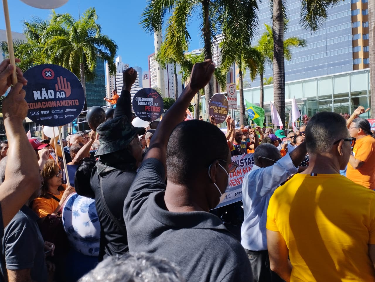 A frente do edifício Torre Pituba, antiga sede administrativa da Petrobrás, em Salvador, foi tomada por centenas de petroleiros (as) aposentados (as), pensionistas e trabalhadores (as) da ativa, na manhã desta terça-feira (30), em protesto contra os equacionamentos do plano de previdência da categoria (Petros).